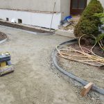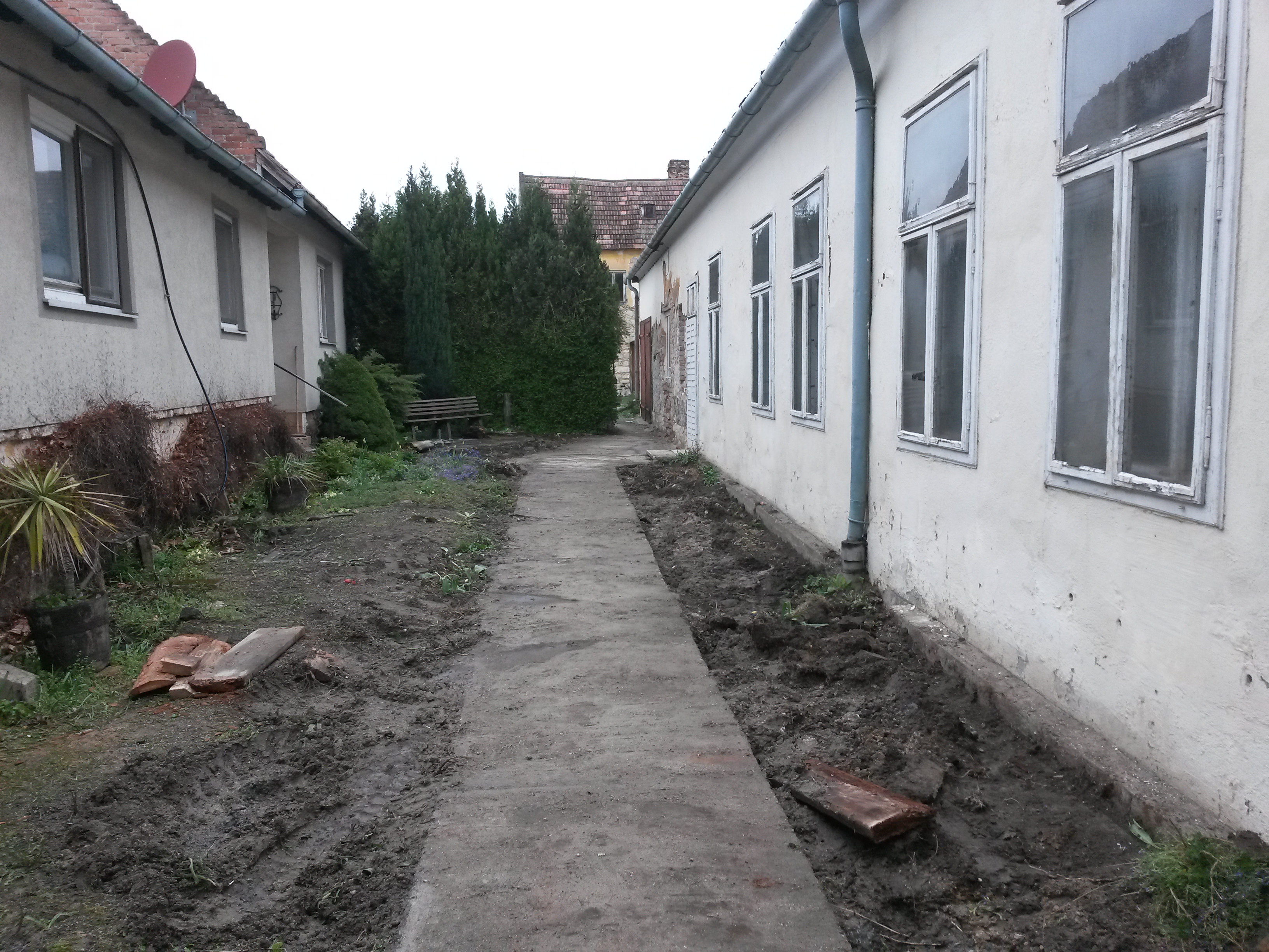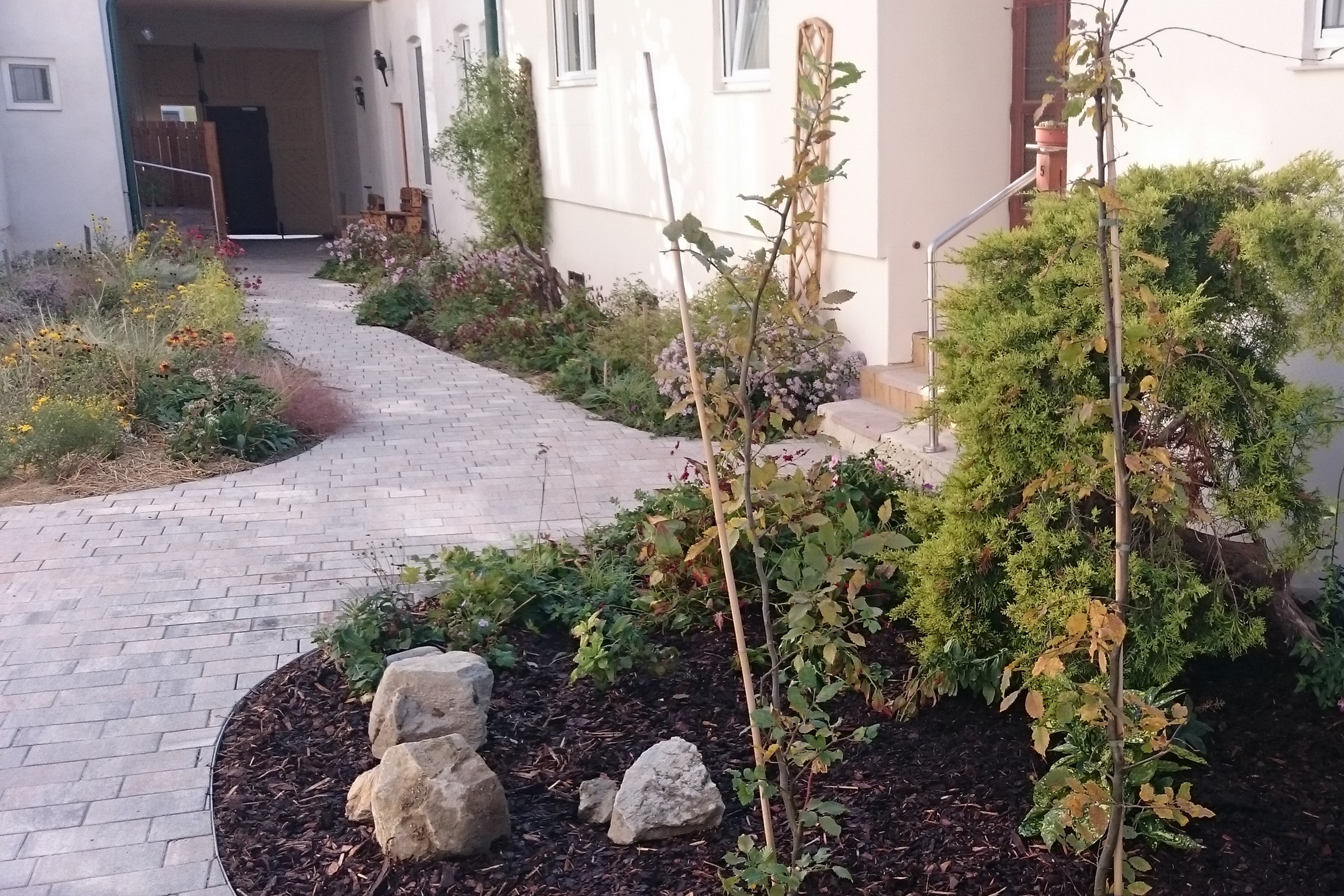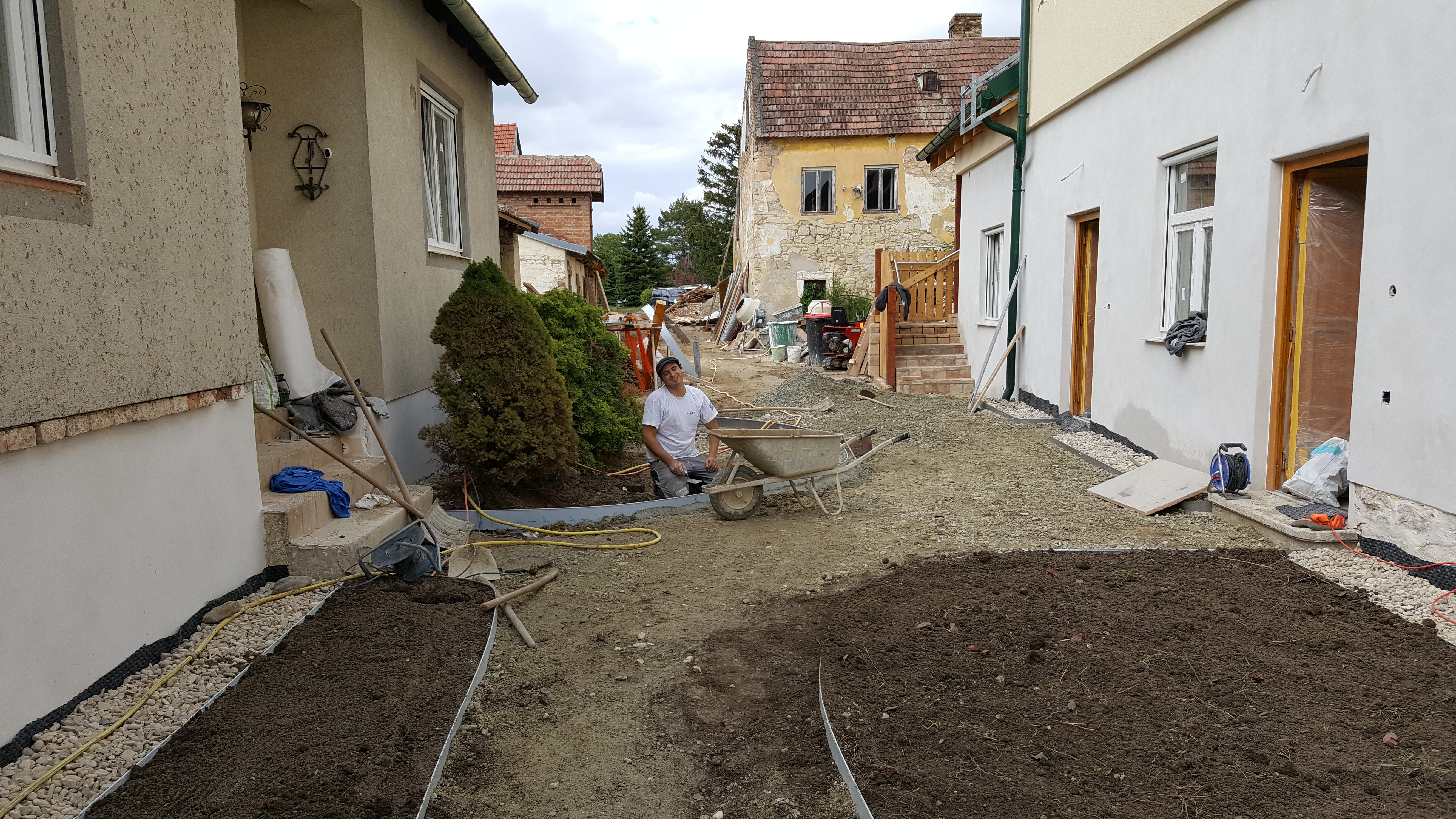 Sobald der Graben zugeschüttet ist und alle schweren und schmutzigen Bauarbeiten erledigt sind, können wir endlich die Gestaltung des Innenhofs angehen: Drainage, Anlage der Beete und zuletzt Pflasterung des Wegs, der sich vom Hauseingang bis zum Brunnenplatzl und der Gemeinschaftsterrasse leicht geschwungen dahinzieht.