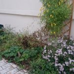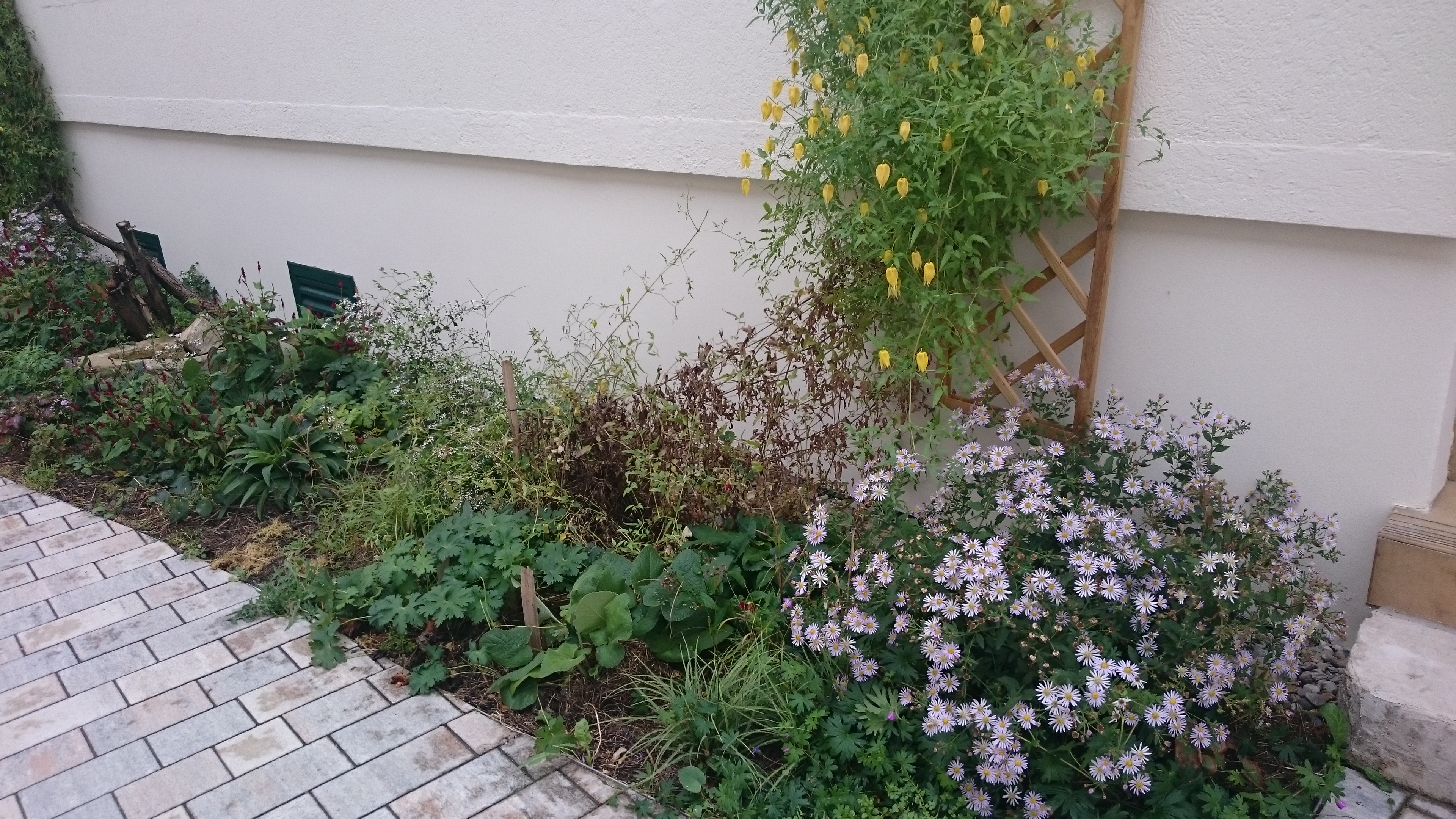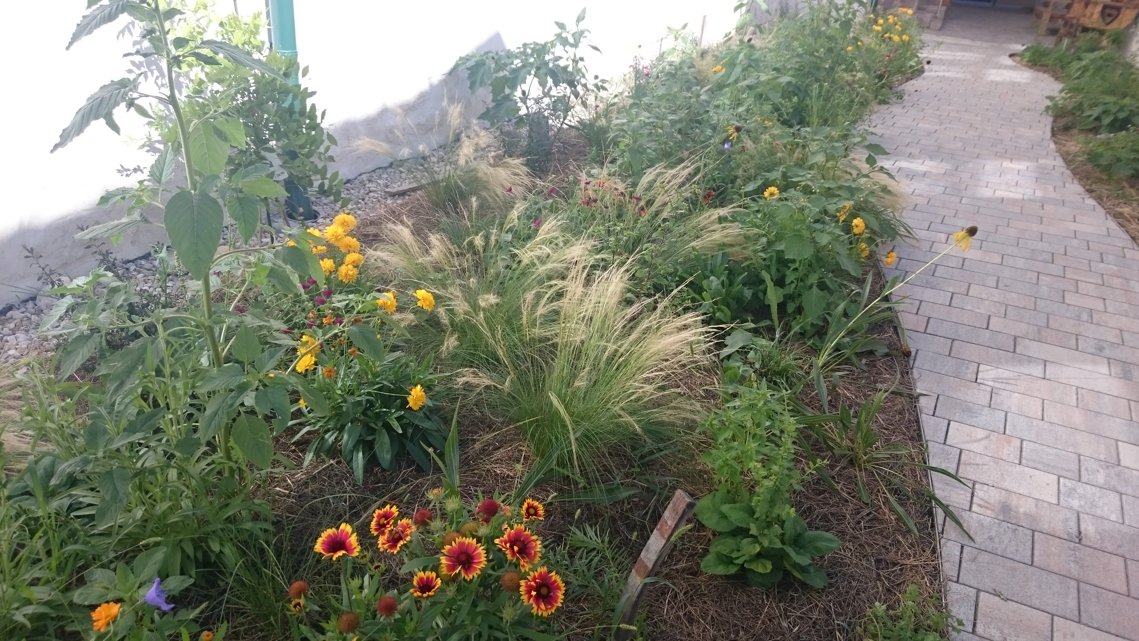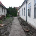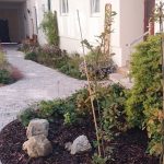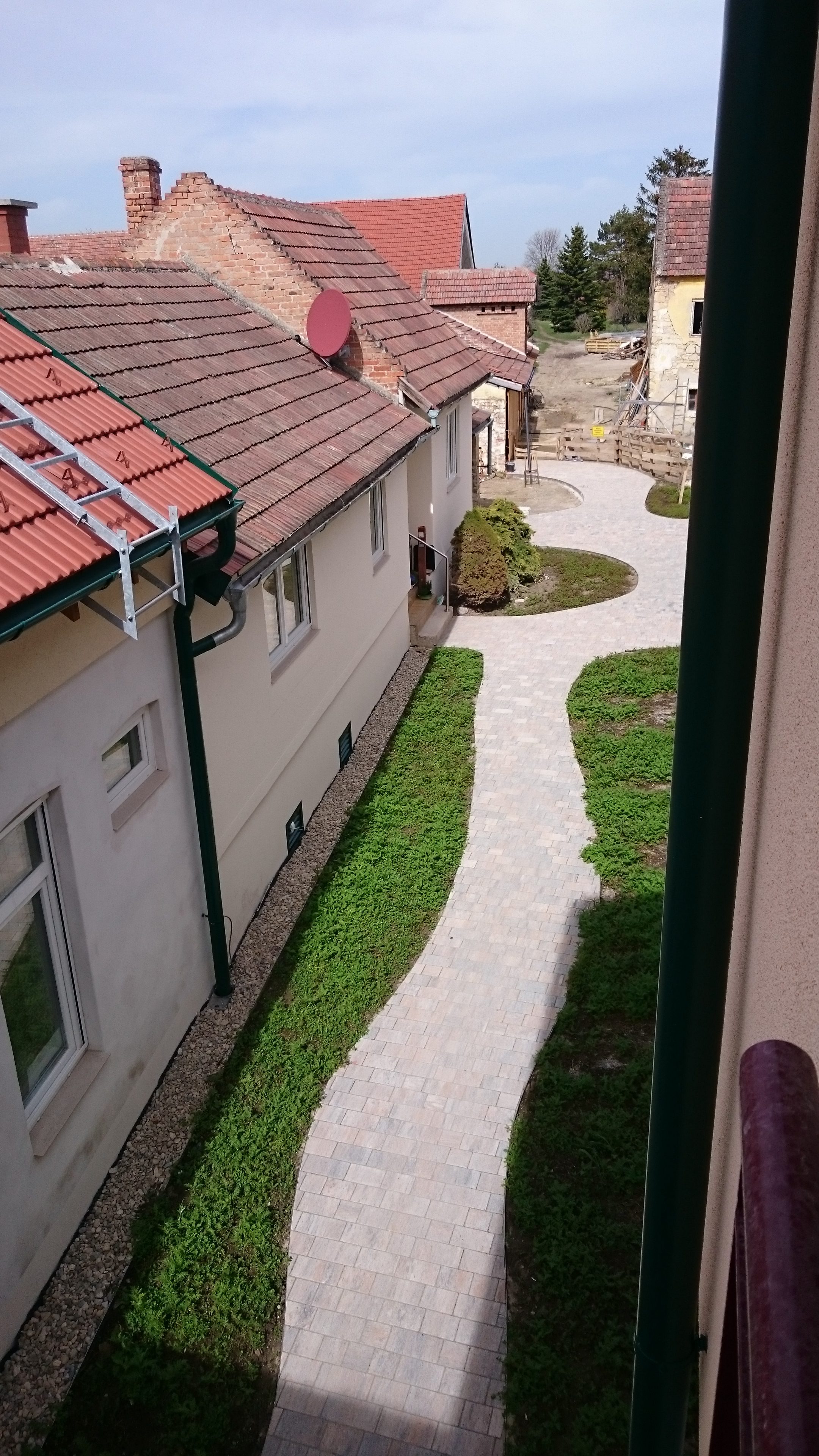 Sobald der Graben zugeschüttet ist und alle schweren und schmutzigen Bauarbeiten erledigt sind, können wir endlich die Gestaltung des Innenhofs angehen: Drainage, Anlage der Beete und zuletzt Pflasterung des Wegs, der sich vom Hauseingang bis zum Brunnenplatzl und der Gemeinschaftsterrasse leicht geschwungen dahinzieht.