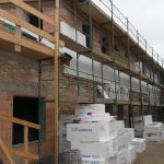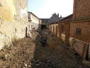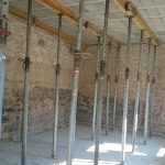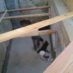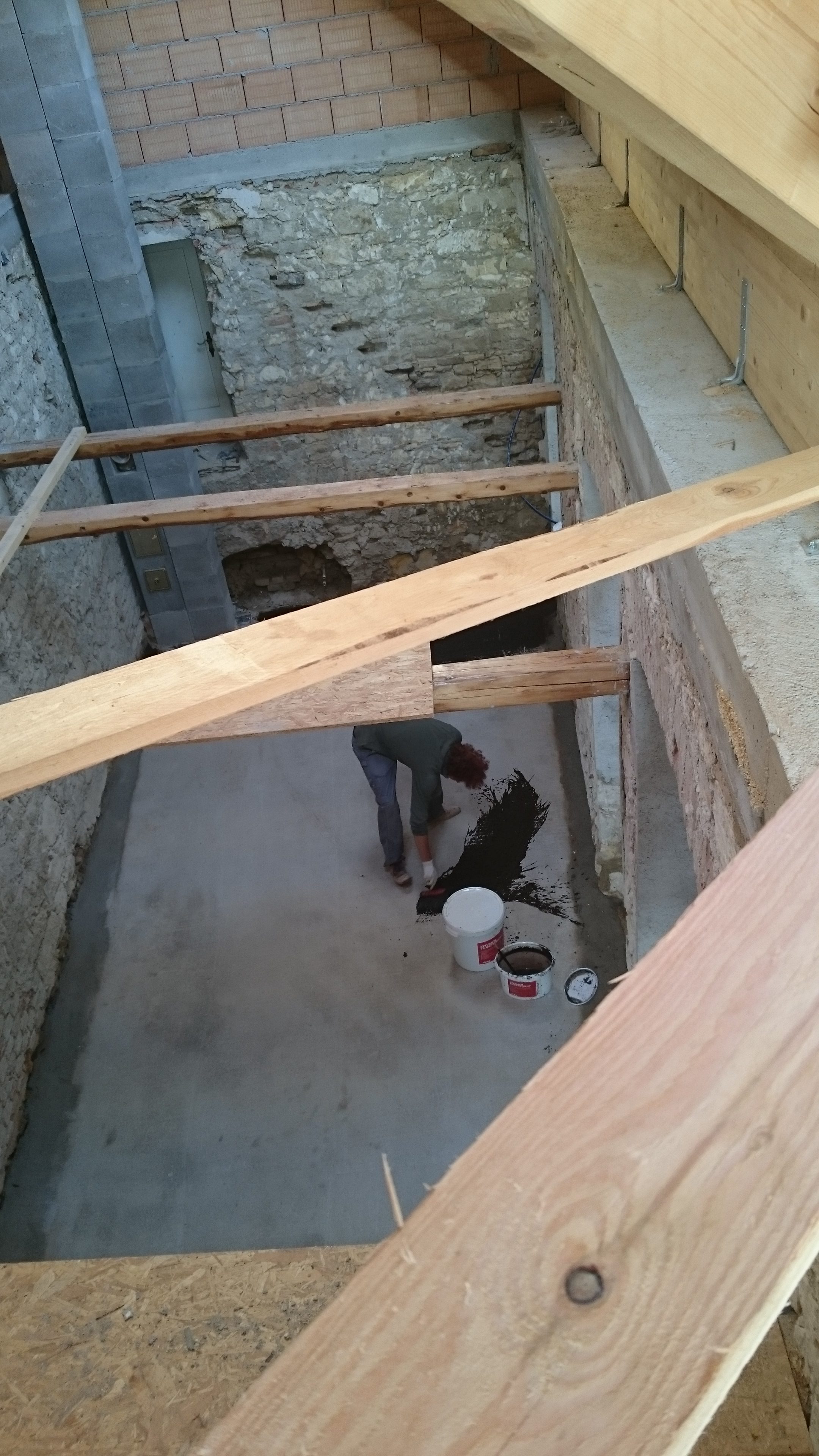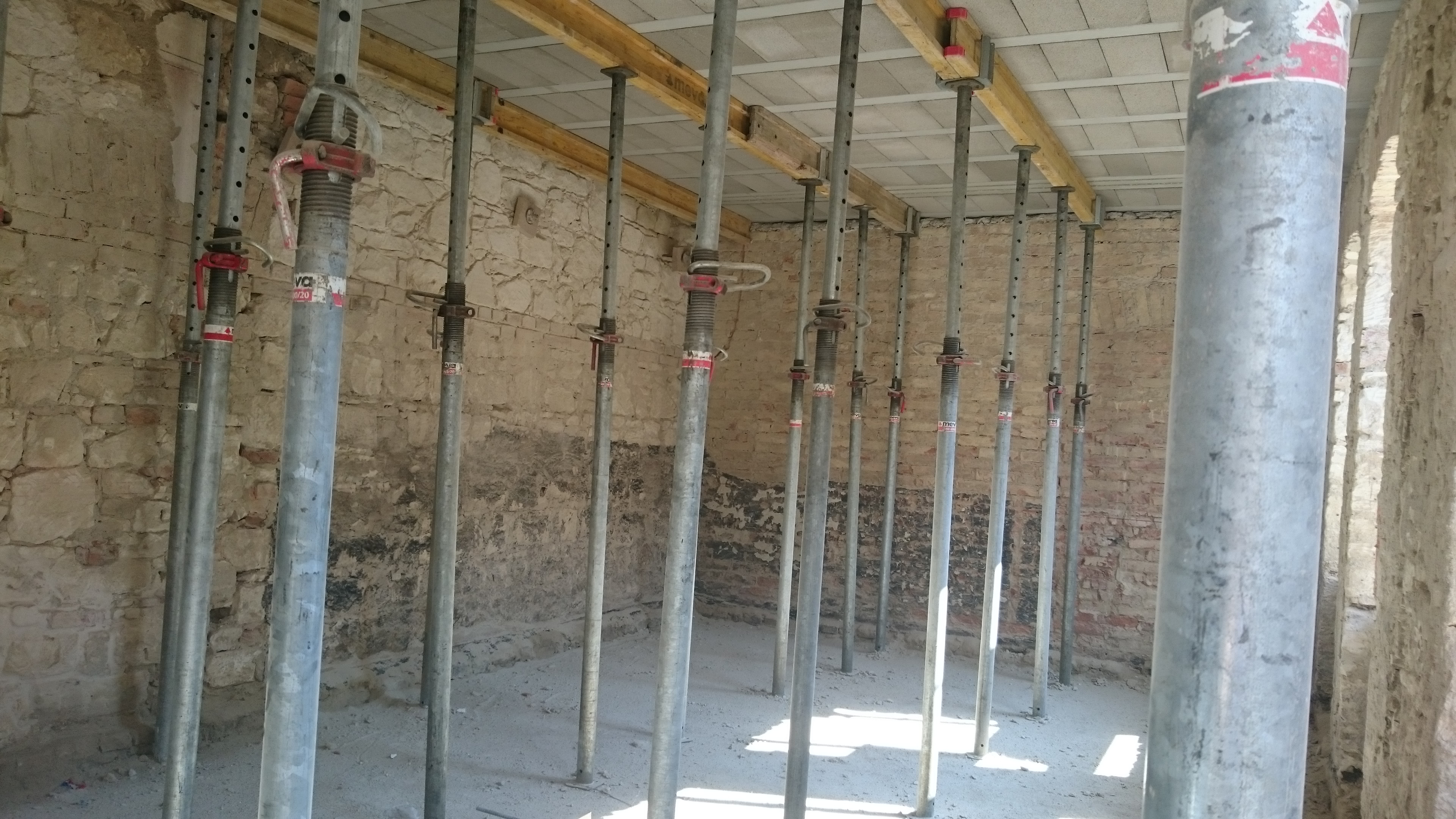 Nachdem dem Abgraben der Erdgeschoßräume folgt Stück für Stück der Wiederaufbau des entkernten Gebäudes: Herstellen der Abdichtung, des Estrichs, Pölzen, Einziehen der Zwischendecke.