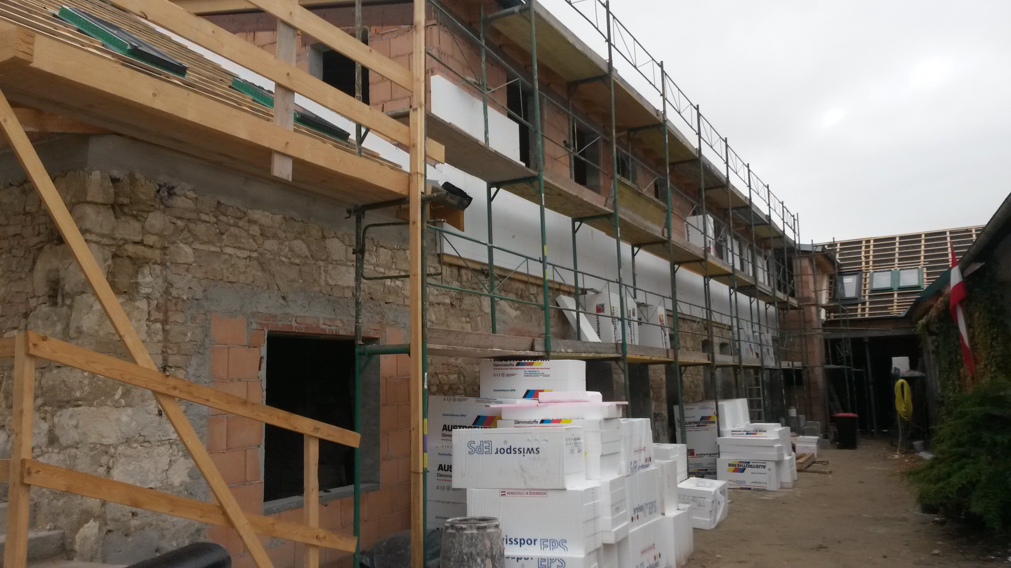 Hier können Sie bald in einer Bildergalerie die Renovierungsarbeiten vom Ursprungszustand, über das Entkernen, Abgraben, Dachstuhl-Erneuern, Wände-Aufstellen, Leitungen-Legen, bis hin zum Innenausbau und der Fertigstellung der Wohnungen und der Außenanlagen mitverfolgen.