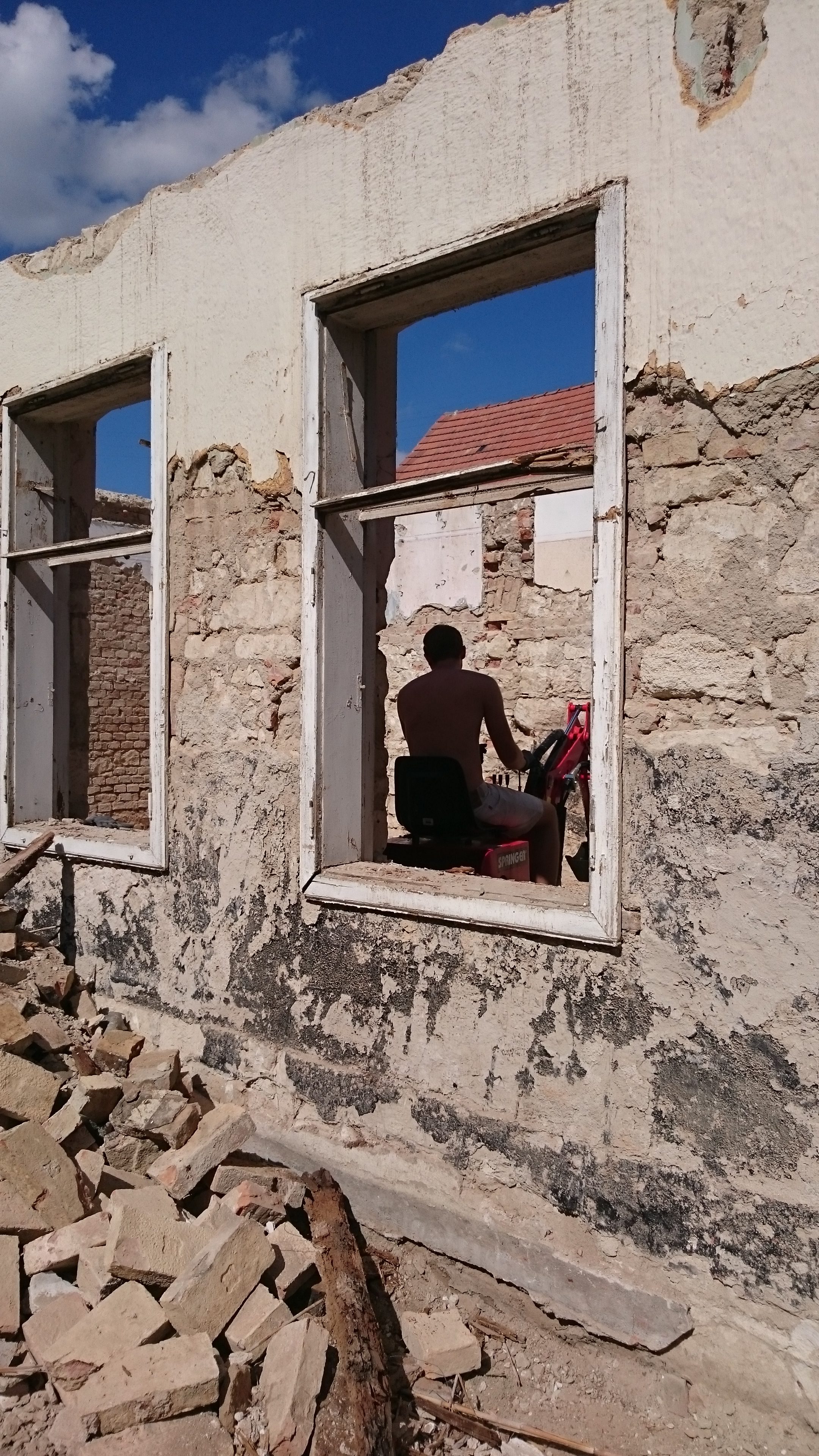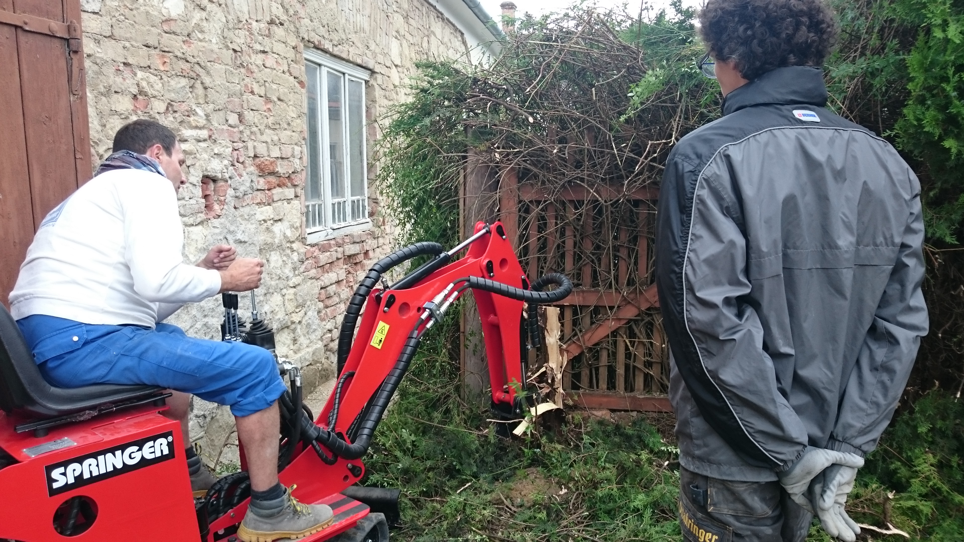 …gefolgt von den großen des Baumeisters, die den alten Dachstuhl wegreissen.