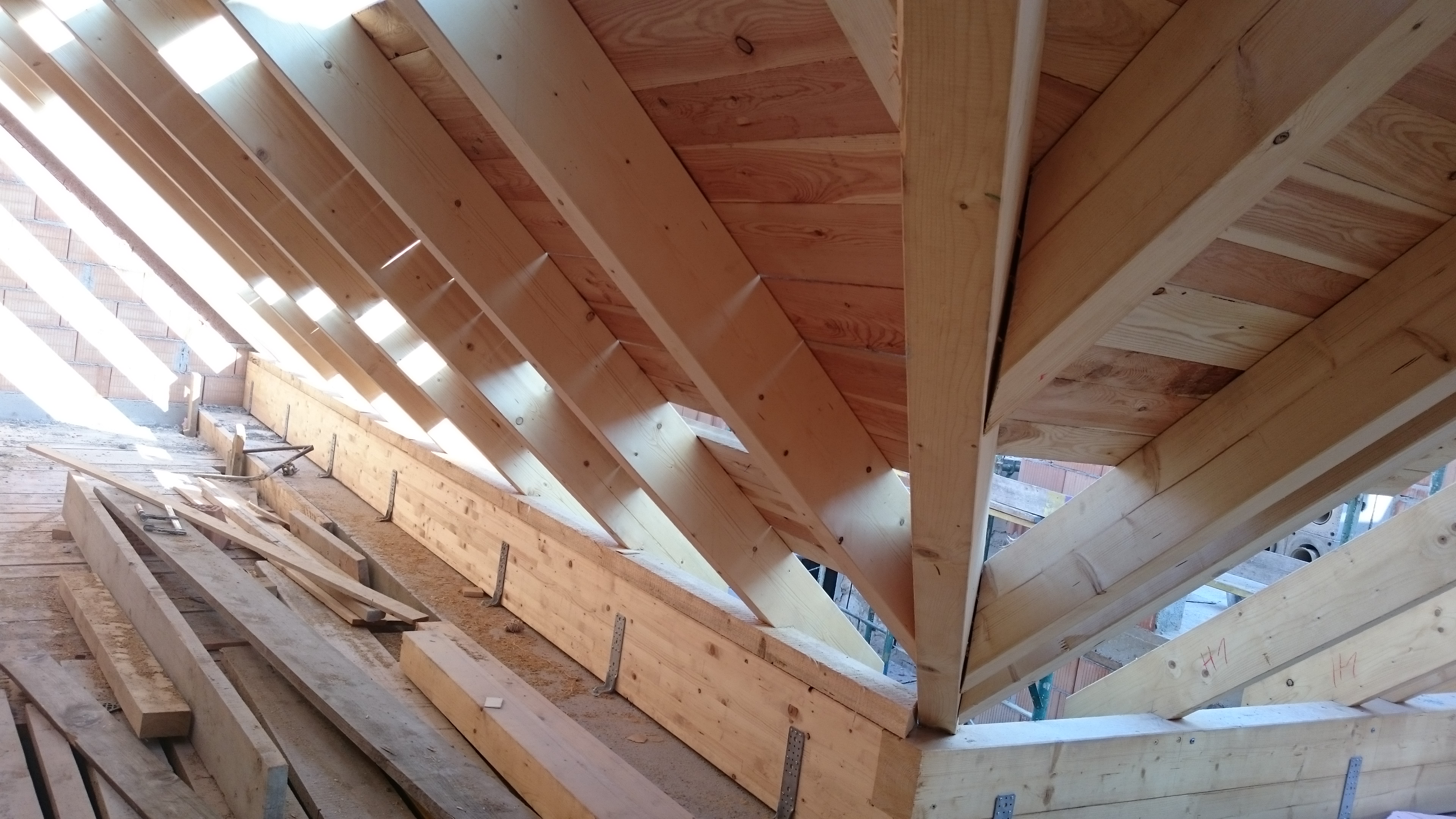 Dann kommen die Zimmersleut‘, es riecht nach Holz und Sägespänen, es wird geschnitten und gehämmert und bald schon können wir die Geometrie von Dachstuhl-Verschneidungen bewundern!